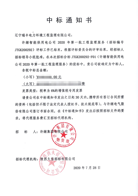 中標(biāo)喜訊-許繼智能供用電公司2020年第一批工程監(jiān)理服務(wù)