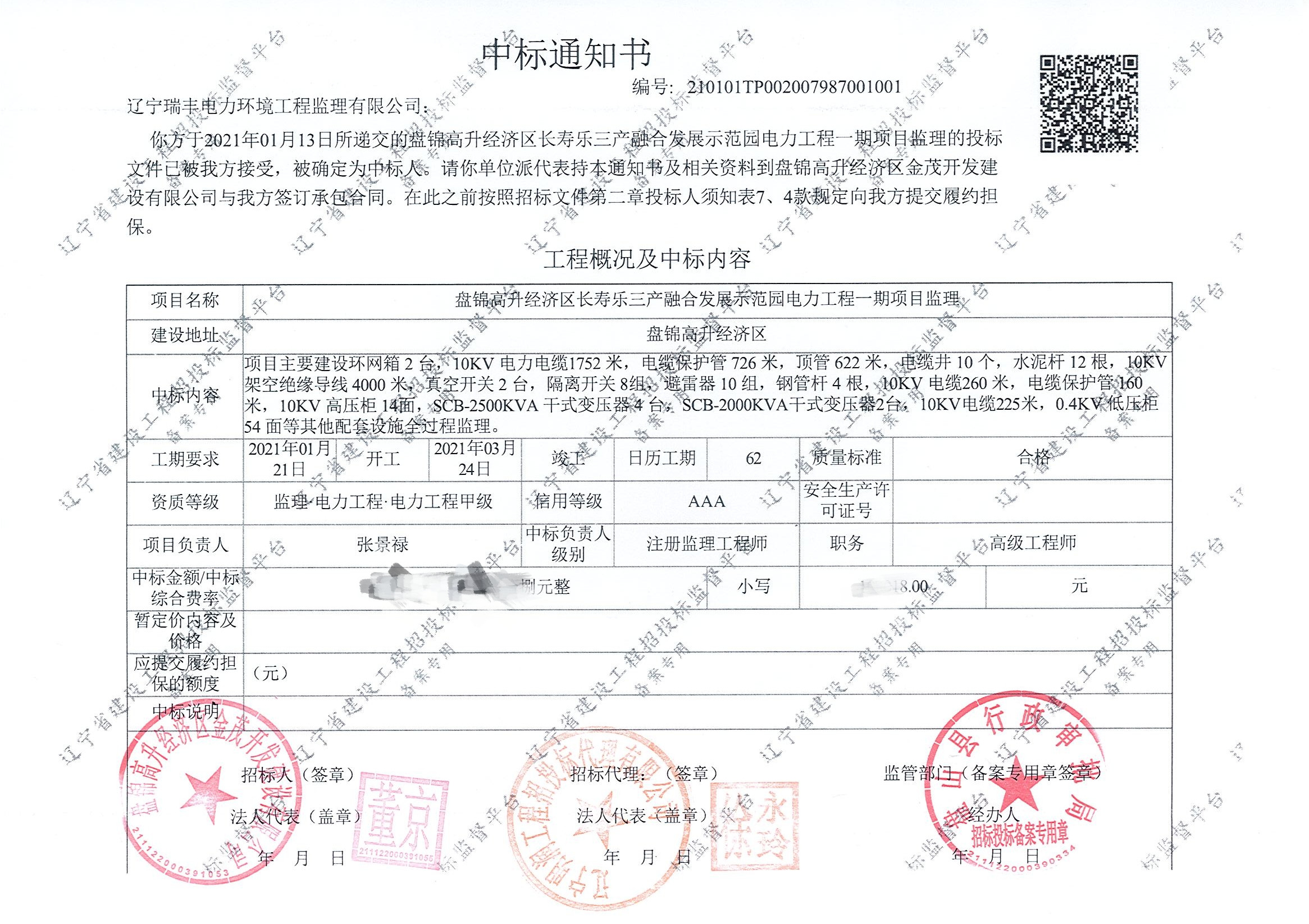 中標喜訊-盤錦高升經(jīng)濟區(qū)長壽樂三產(chǎn)融合發(fā)展示范園電力工程一期項目監(jiān)理