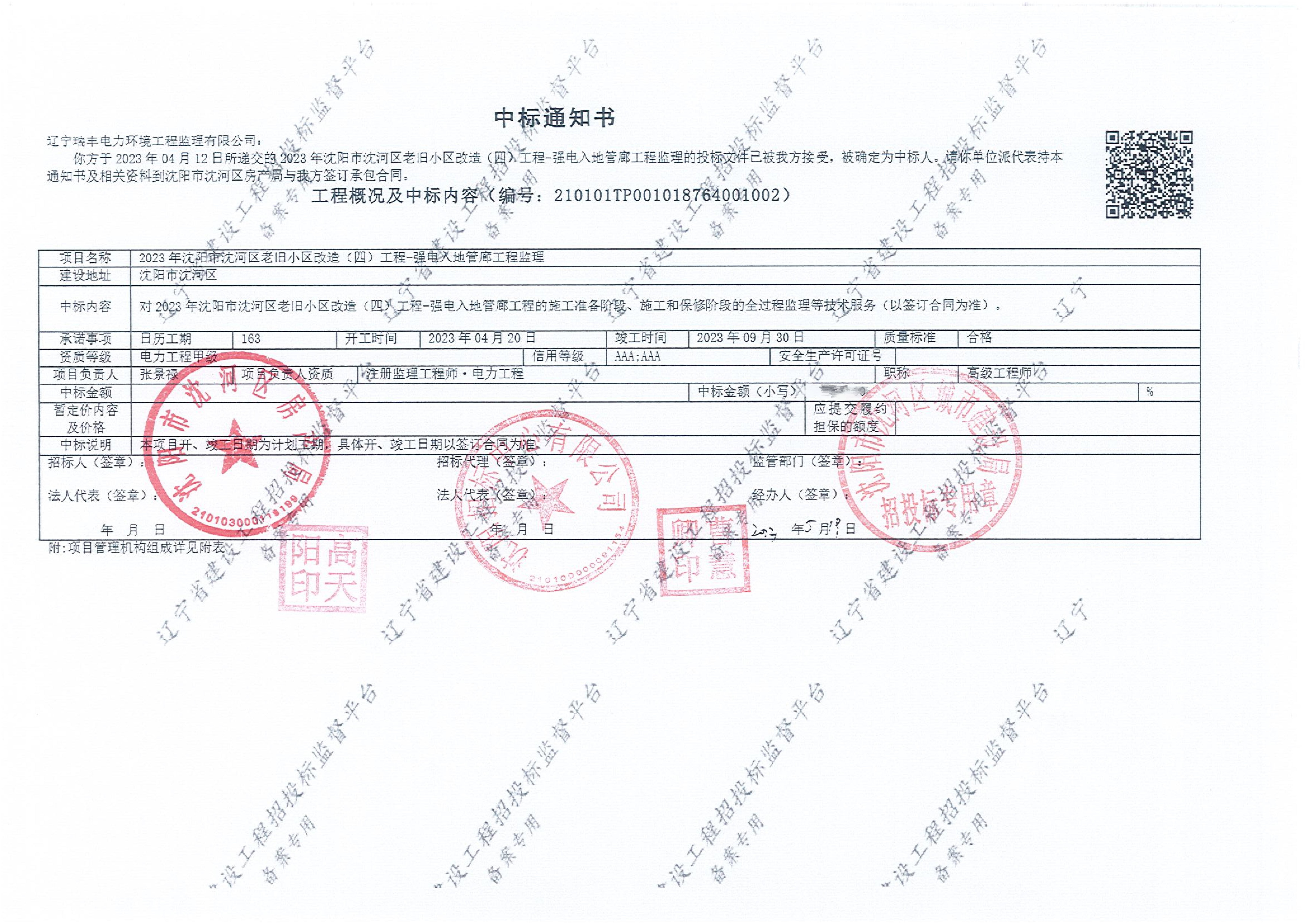 中標(biāo)喜訊-2023年沈陽(yáng)市沈河區(qū)老舊小區(qū)改造(四)工程-強(qiáng)電入地管廊工程監(jiān)理