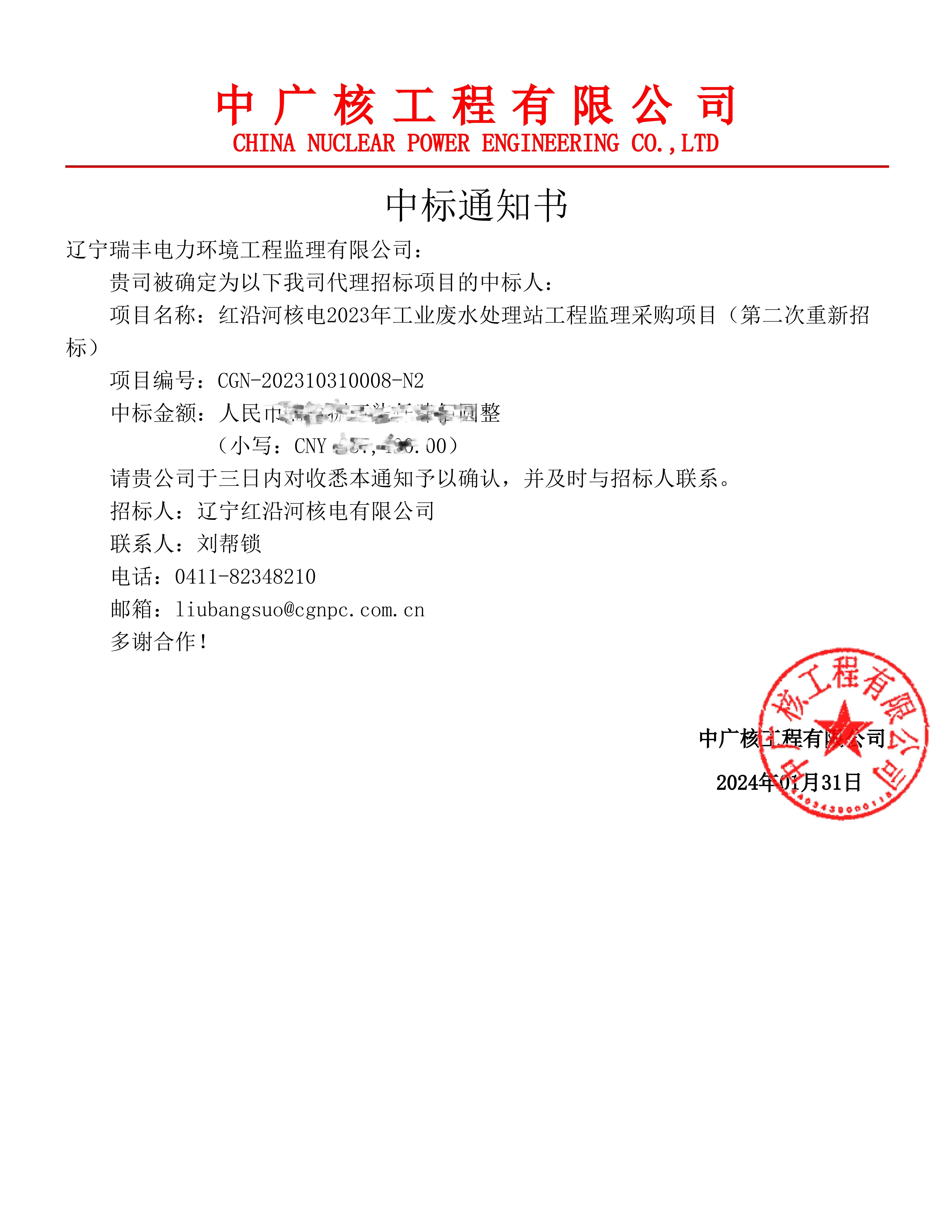中標(biāo)喜訊-紅沿河核電2023年工業(yè)廢水處理站工程監(jiān)理采購項(xiàng)目