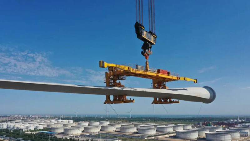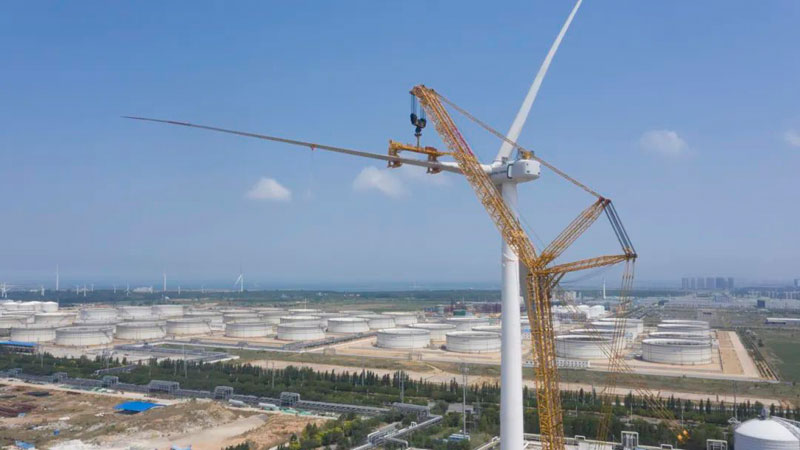 針對風(fēng)電部件的龐大和脆弱性,項目團隊經(jīng)過反復(fù)討論,不斷優(yōu)化施工工藝和流程,啟用4000噸級履帶式起重機全球首次塔式工況進行主吊,多臺副吊協(xié)同,通過水平單葉片吊裝方案和超高工況下互補模式進行吊裝,避免了吊裝過程中的損傷風(fēng)險,保障安全的同時提高施工效率。