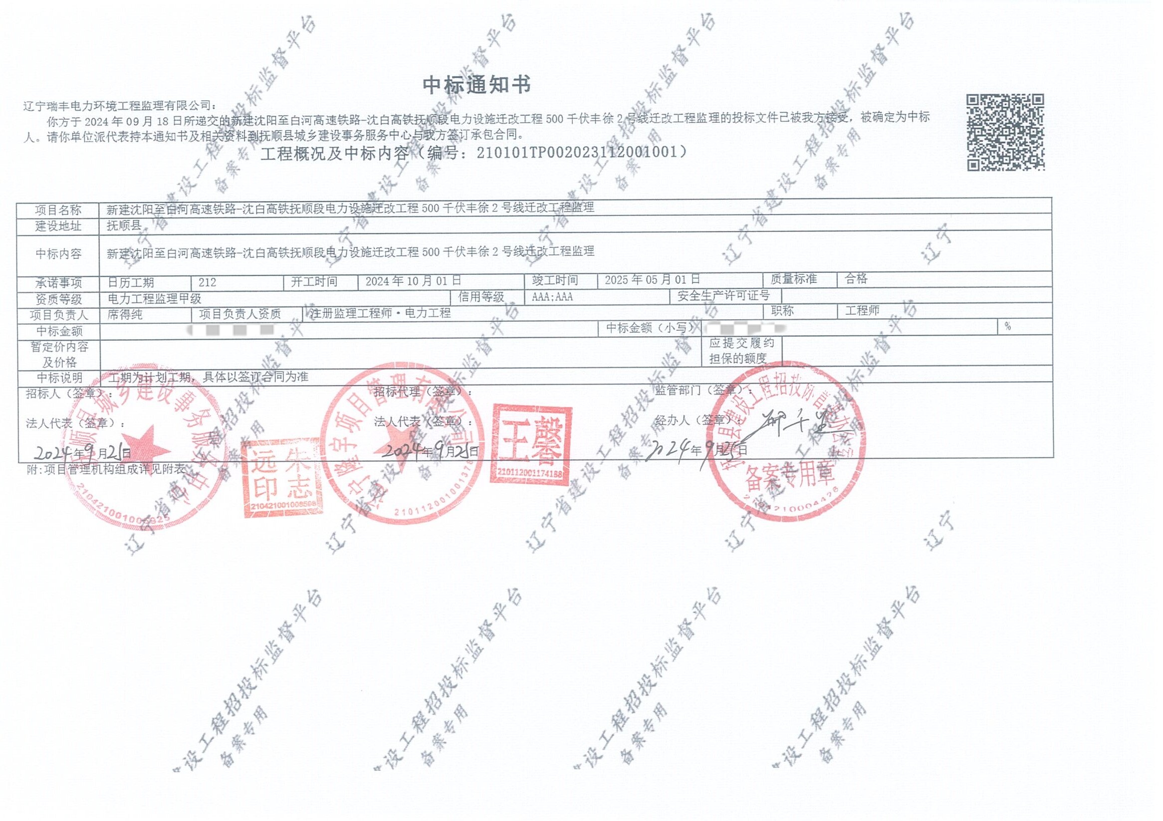 中標(biāo)喜訊-新建沈陽至白河高速鐵路-沈白高鐵撫順段電力設(shè)施遷改工程 500 千伏豐徐2號線遷改工程監(jiān)理