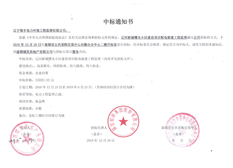 中標(biāo)喜訊-遼河新城曙光小區(qū)建設(shè)項(xiàng)目配電新建工程監(jiān)理